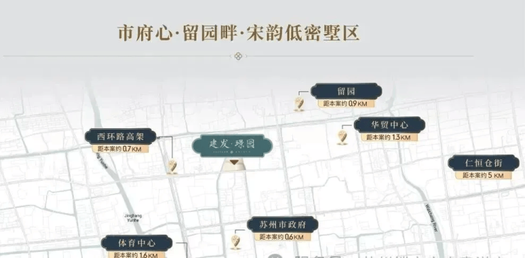 不可复制的资源:距离苏州市政府仅约 600 米,步行可达留园(约 900 米)、西园寺(约 700 米),周边 5 公里内环伺寒山寺、山塘街等 10 处名胜古迹,真正实现了“出则繁华,入则宁静”。