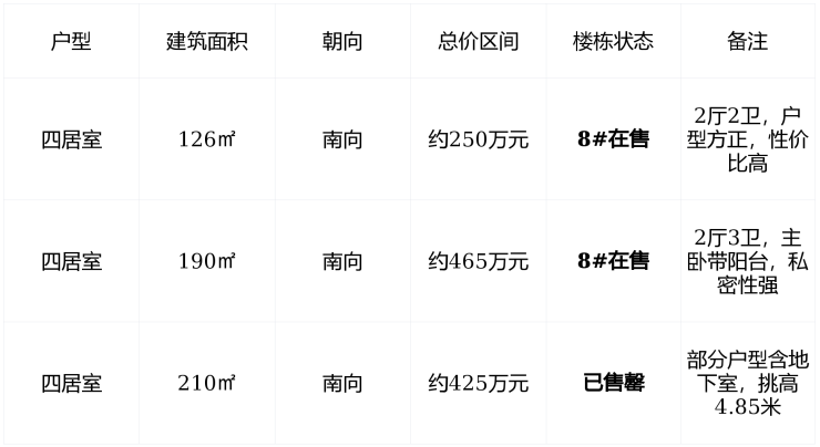 剩余房源 :目前仅 8#楼 仍有少量房源在售,其余楼栋基本售罄