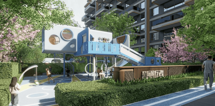 景观:400㎡下沉水庭院、700米林荫跑道、全龄运动场地