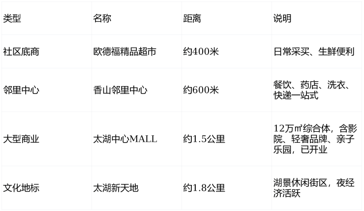地铁5号线香山站:步行约690米(约10分钟),1站到木渎,3站达苏州新区,15分钟直达市中心。