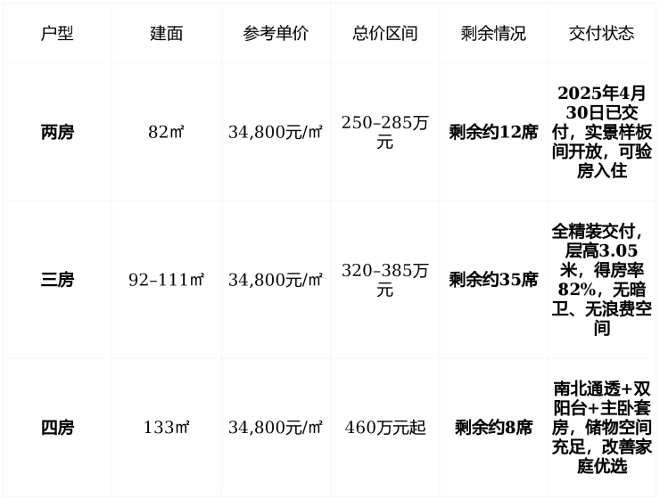 💰 在售情况:现房清盘尾声,总价250万起,得房率超80%,精装标准不输改善盘