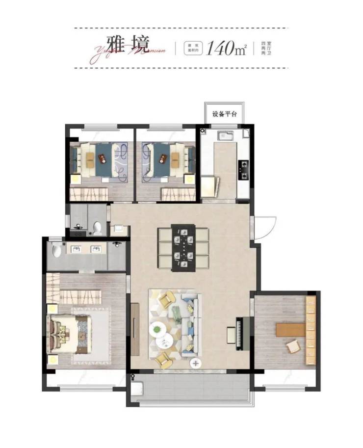 建筑面积约140㎡雅境户型,四室两厅两卫,采取了双台盆设计,好的人居住宅作品,卫生间不仅该注重美观,实用性也是相当重要。