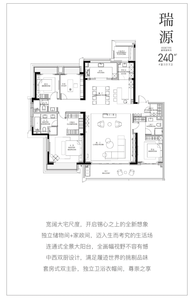 户型亮点:主力户型158㎡-300㎡大平层,层高3.15-3.3米,空间通透。158㎡为三卫设计,300㎡户型配备南北双阳台及华为智能家居系统。