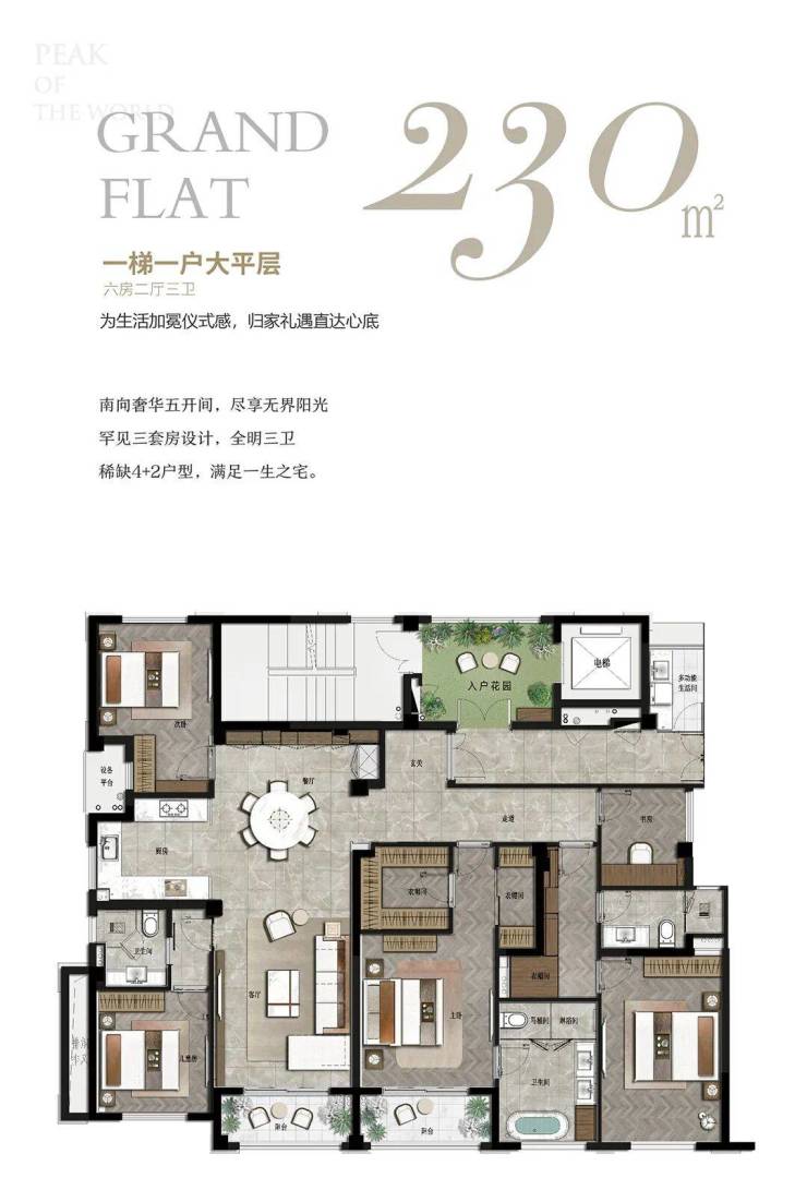 230㎡六房二厅三卫罕见三套房设计可分设父母房、儿童房、书房/客房南向五开间+双阳台适合三代同堂或高净值家庭