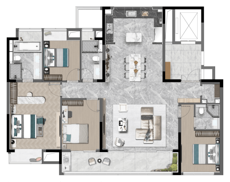 189㎡四室三卫:双主卧套房设计,主卧带270°转角采光 + 大浴缸,厨房配备西门子全套厨电、净水系统 。