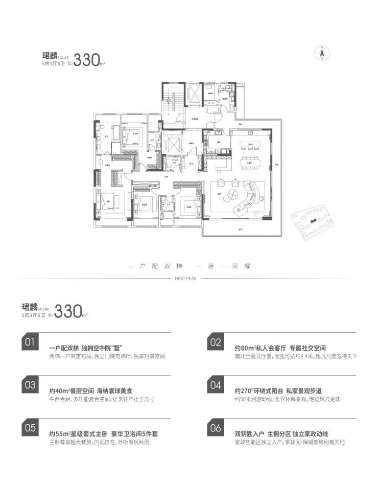户型设计:143-330㎡精装大平层,层高3.15米,厅堂面宽4.5-8.4米,空间通透感强。