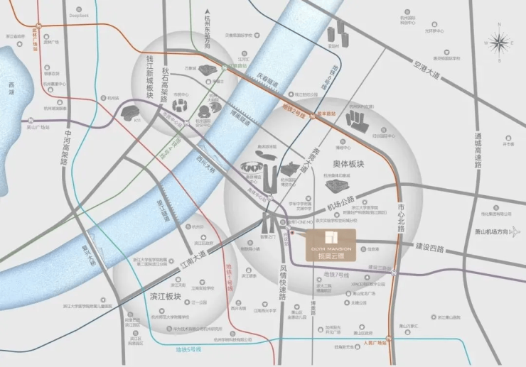 项目为地铁7号线兴议站上盖,步行约200米可达,1站直达奥体中心,3站至万象城,4站接驳在建SKP,实现“地铁一键直达城市核芯”的生活模式 。同时周边“三横两纵”路网密集,快速通达滨江、钱江新城等核心板块。