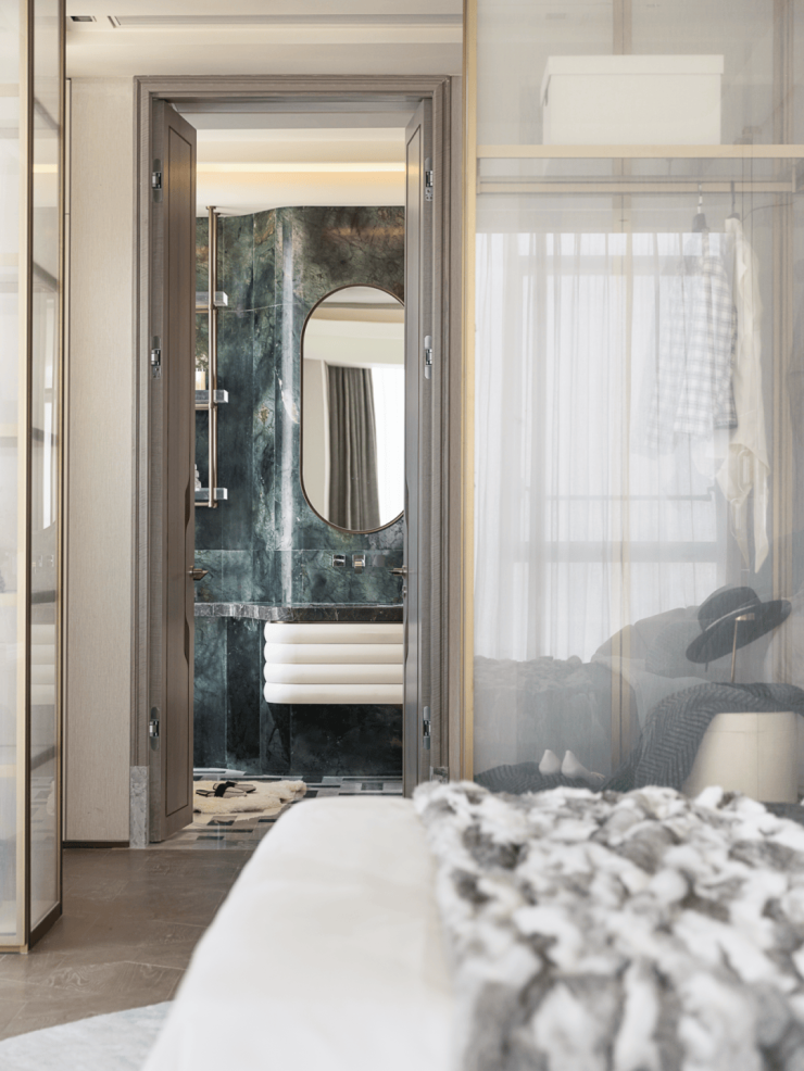 空间划分中,匠心独具的‘核心筒’将中厨、西厨与家政间完美融合,如建筑枢纽般的结构应用。核心筒围合空间核心,开设两个门洞,一端可见玄关端景墙面,另一端则流畅连接西厨与中厨,构建起动线的自然过渡。凯旋门位于玄关右侧,材质与核心筒呼应着,清晰区分公区与私领域,空间在有序中灵动交织。