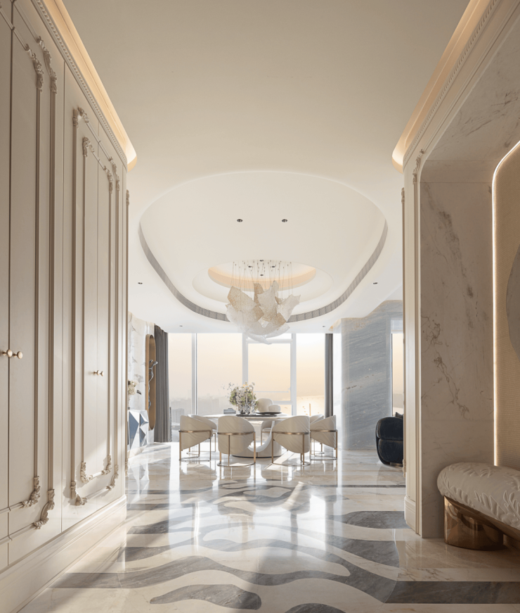 设计师在这处空间中,展现出了非凡的创意与匠心。他巧妙地打破了传统空间的束缚,让动线不再受限,居住者可以自由地穿梭于各个区域之间。这种设计不仅让空间显得更加灵动与开阔,更将奢华豪邸应有的华贵气度,毫无保留地融入到了每一个细节之中。