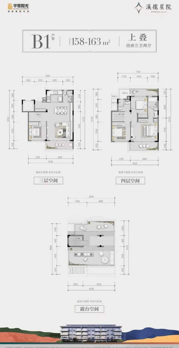 建面约158~163㎡上叠:顶层景观阳台/餐客一体连厅/套房式主卧/舒奢三卫设计