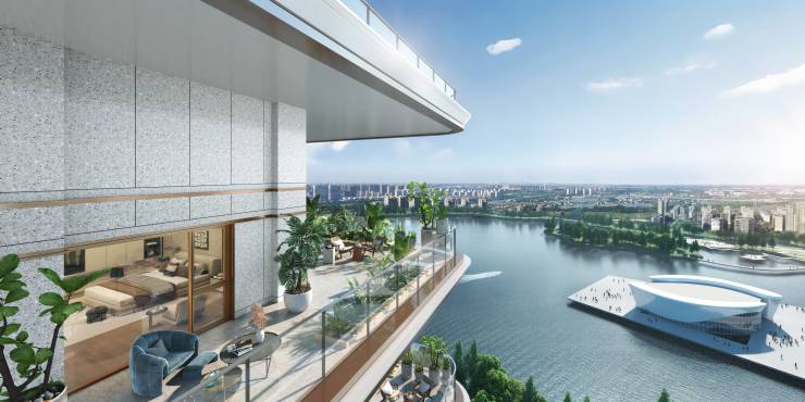项目创新采用"空中庭院+垂直绿化+共享空间"三位一体设计理念, 实现"户户有露台,家家有庭院"的森林氧吧生活愿景。外立面采用180°-360°环幕式露台设计,突破传统四代住宅奇偶错层布局,构建"湖境—园境—院境"的立体景观空间。