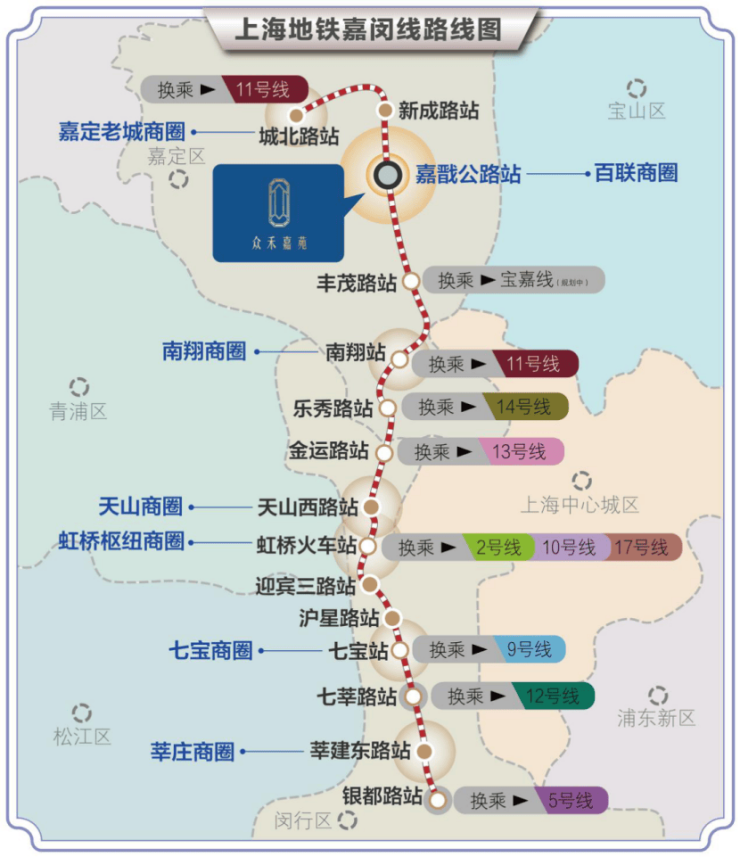 嘉闵线嘉戬公路站:直线距离仅20米,出小区门即达,2站到南翔,6站直达虹桥枢纽,8站到人民广场。