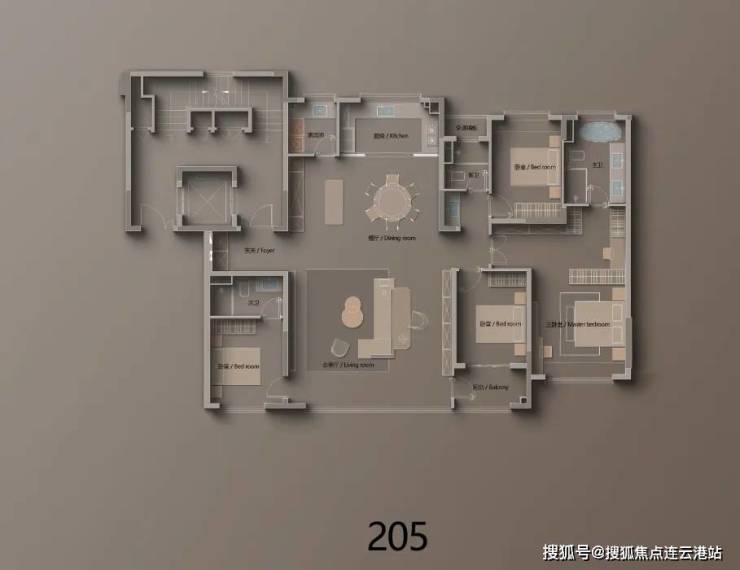 四房两厅三卫户型,三卧室朝南+南向双套房,私密性与舒适感兼具,星级酒店式主卧套房尺度感拉满。