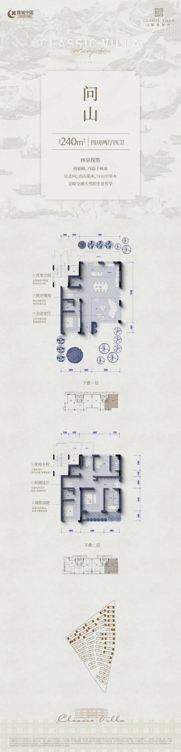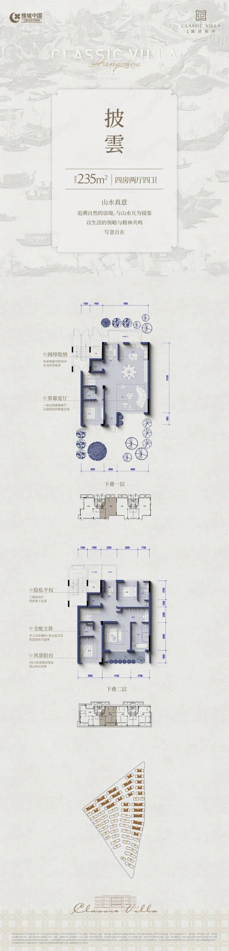 主力户型:建面约235㎡–300㎡,四层台地设计,四房两厅四卫,空间布局科学,满足三代同堂需求。
