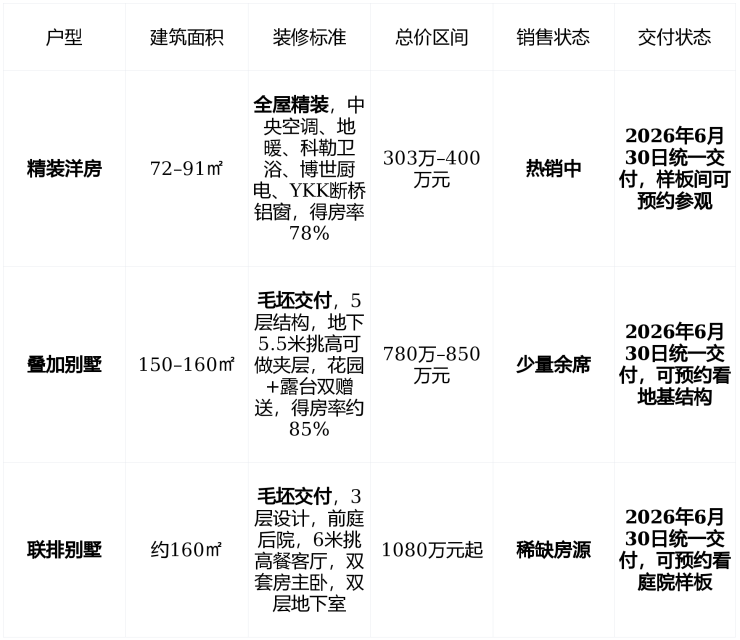 在售状态 : 主力户型72–91㎡精装洋房(总价303万–400万)、150–160㎡毛坯叠墅/联排(总价780万–1080万),余量充足,无摇号,2026年6月30日统一交付 。