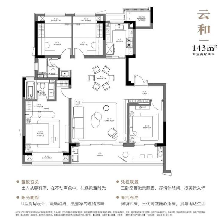 主力户型:建面约143㎡(4房2厅2卫)、185㎡(4房2厅3卫)、225㎡(4房2厅3卫),精装交付