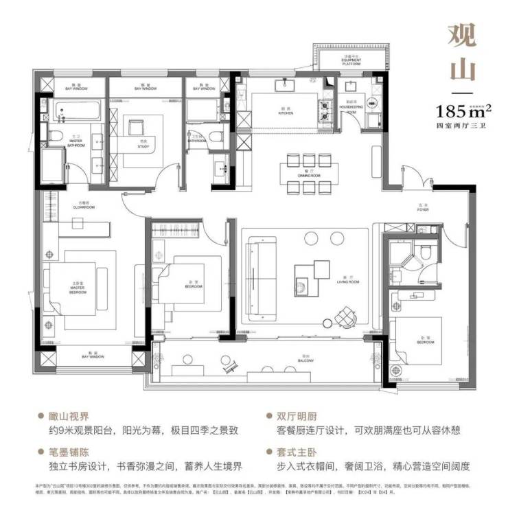 建面约185㎡的户型,整体是一个四房+三开间朝南的设计,大横厅、9米观景阳台、双套房、主卧的步入式衣帽间&浴缸这些改善的标志性元素一个没缺。