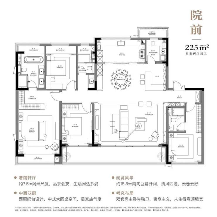 225㎡户型:客厅面宽7.5米,南向双联阳台约18.8米,中西双厨+双套房设计