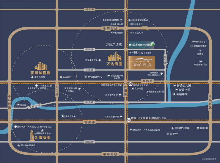 苏州轨交S1线(昆山段)规划经停周市站,距项目约2.5公里,预计2028年后开通,未来可实现30分钟直达苏州园区
