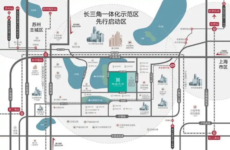 高铁枢纽 :距在建 苏州南站 (沪苏湖高铁+通苏嘉甬高铁交汇)仅 7公里 ,通车后 20分钟直达上海虹桥 ,30分钟到杭州、南京。