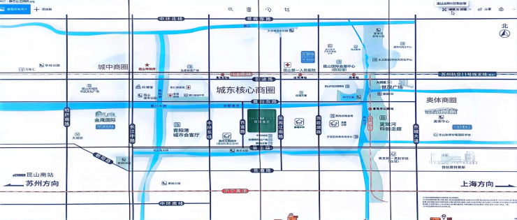自驾网络:项目紧邻娄东路、吴淞江路、前进东路、中环东线等城市主干道,驾车至昆山市中心约15分钟,至苏州工业园区约25分钟,通过沪宁高速可快速接入长三角高速路网,通勤效率在城东板块位居前列。