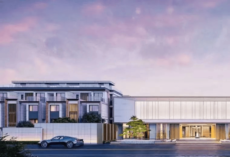 规划36幢上下叠纯叠墅,外立面采用香槟色木纹铝板+大面积玻璃幕墙,容积率1.2,绿化率30%