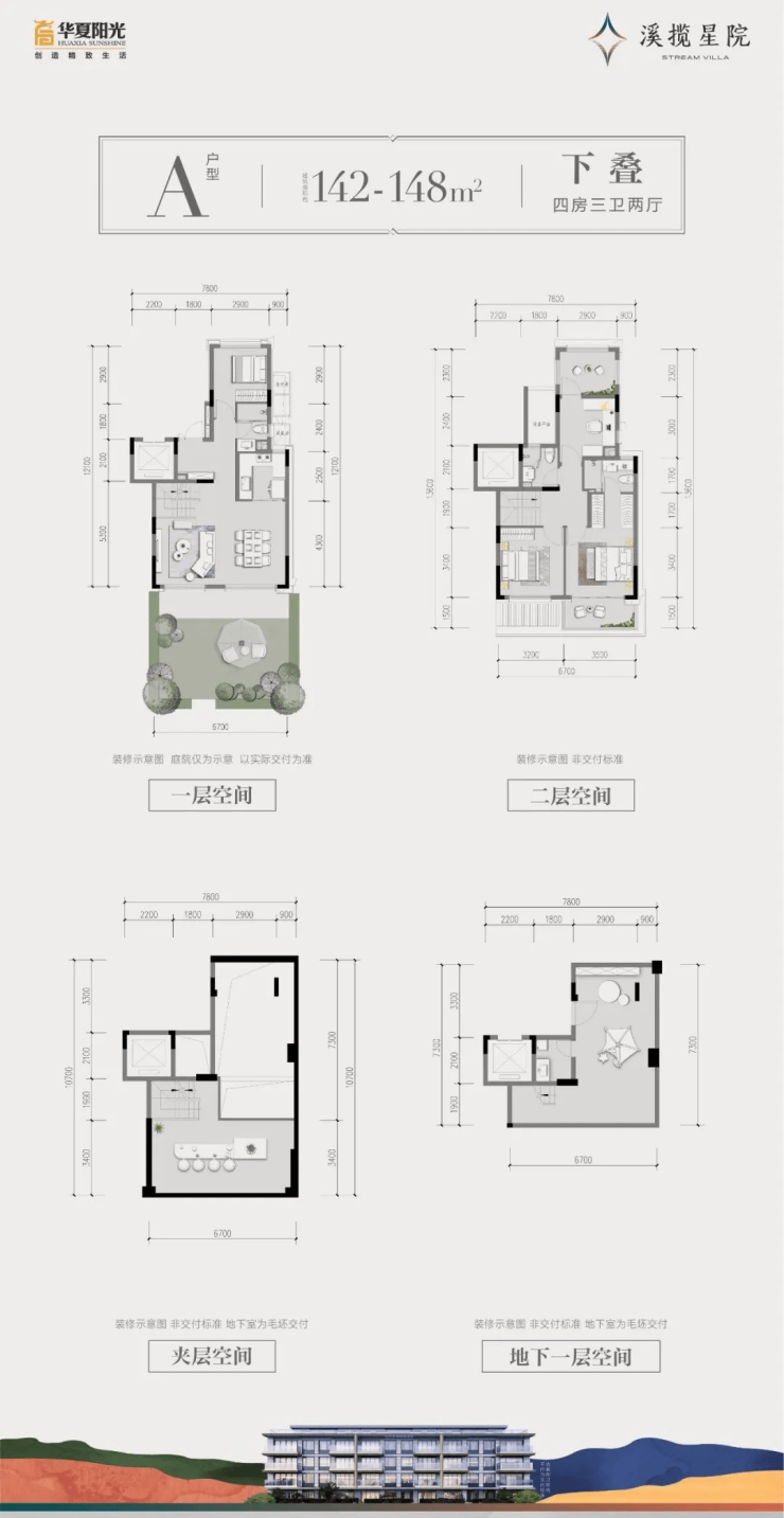 建面约142~148㎡下叠:地下室多元空间营造/餐客连厅/奢适双卧/南向阔景阳台