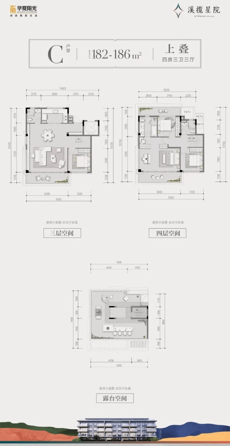 建面约182~186㎡上叠:约6m顶层观景阳台/餐客厅、书房开放设计/套房式主卧