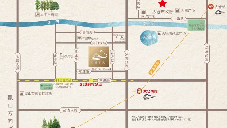 距离太仓南站约4公里,沪通高铁30min直达上海虹桥;周边有G15沈海高速、204国道等主干道,规划中的苏州轨交S1支线和上海轨交11号线延伸段将进一步增强通勤便利性