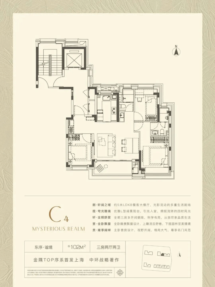 102㎡三房两厅两卫:三开间朝南,客厅面宽达5米,连接6.2米观景阳台,主卧带观景飘窗,厨房采用U型布局,空间利用率极高