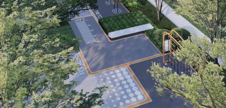 在景观环道上,规划出适合不同阶段人群的运动提示,并根据需求不同设置 四段式运动跑道,设置距离指示标记,不管是大人还是孩童,都能在清晰的刻度下,见证每一天的健康生活。