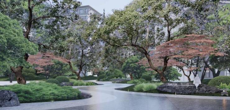 移步间,可找到苏式园林意蕴,亦能体会现代造园的巧妙,将 生态、健康、人文三大因素糅合于其中,以景会邻,以景乐活,传达洋房生活的诗意与惬意。