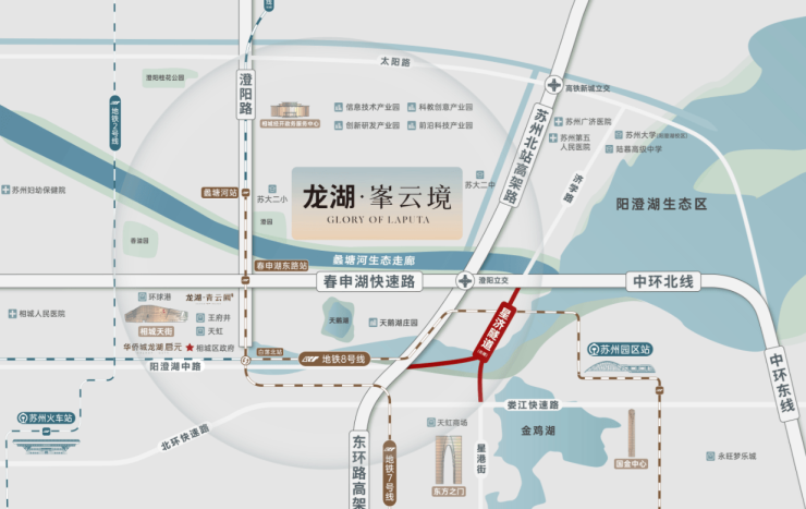 约3公里高阶生活圈尽显醇熟:龙湖相城天街、王府井、环球港等百万方旗舰商业环伺,国际品牌、米其林餐厅一应俱全;苏州第二实验学校(小学、中学部)就在家门口,广济医院、相城人民医院为健康保驾护航;蠡塘河生态走廊、学府公园与阳澄湖近在咫尺,繁华与诗意随心切换^。