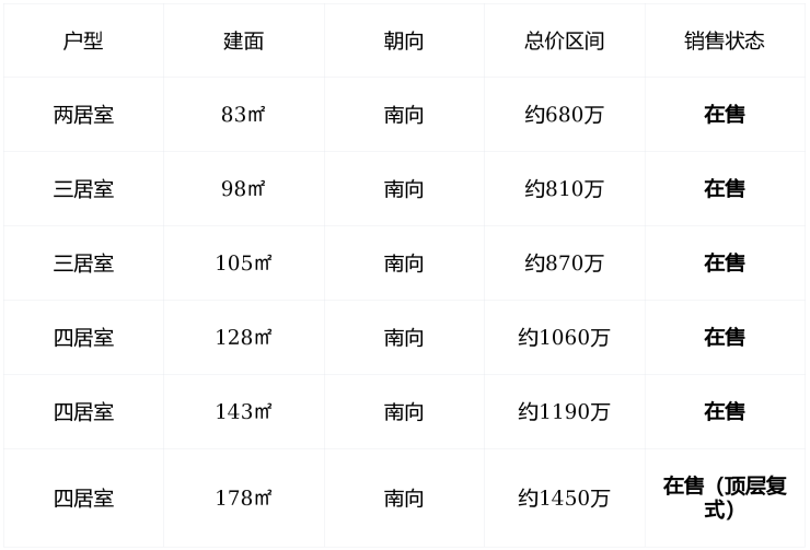 库存状态 : 剩余房源约120席 ,主力户型(98–105㎡)售出约60%,仍处全面在售期, 非清盘倒计时