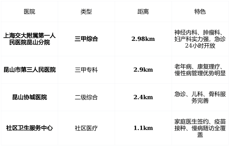 医疗真实力3公里内覆盖三甲+专科+社区三级医疗网 ,是 昆山城西医疗配套最完善的住宅项目之一
