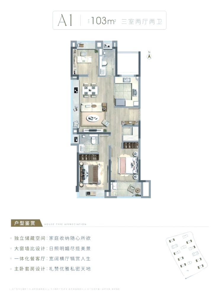 103㎡三房:边套设计,三面采光,视野开阔,配备独立收纳区