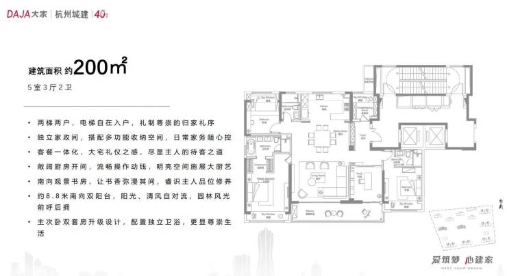 全屋精装修交付,标配中央空调、地暖、新风系统,主力户型层高3米,采用现代简约风格外立面(铝板+玻璃幕墙)