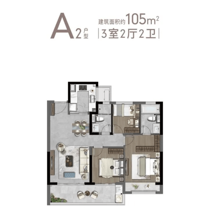 105㎡三室两厅两卫278万起约2.65万元/㎡经典竖厅设计,U型厨房连接生活阳台