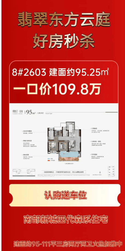 产品:主力户型为建面约95㎡三房、108-111㎡四房,得房率71%-110%(含赠送面积),层高约3米(首层3.6米)