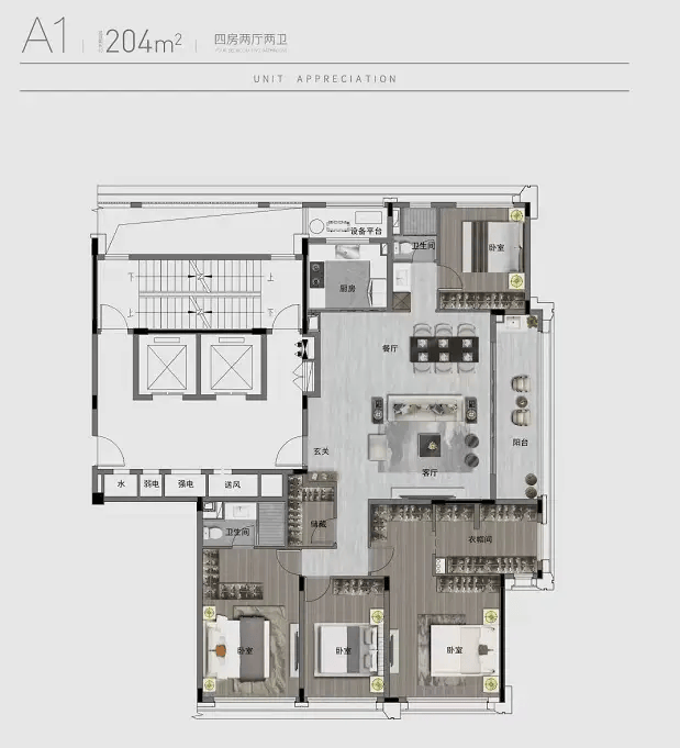 204㎡ 47,000–48,500元/㎡ 548万–580万元 4,000元/㎡精装(方太厨电、科勒卫浴、西门子家电、地暖新风) 主力成交户型,南向三开间,得房率超78%,改善首选