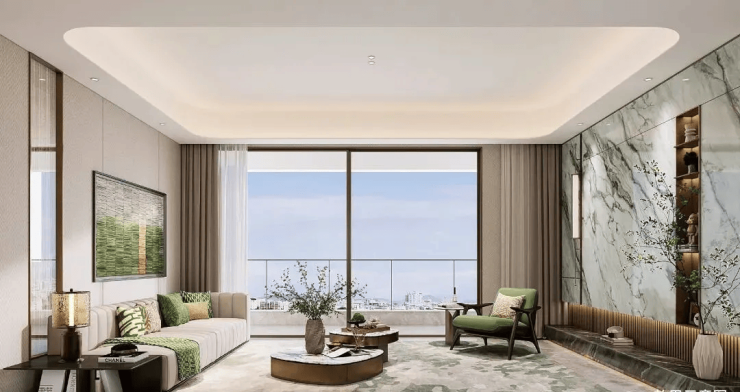 空间设计:户型采用大面宽、短进深设计,143㎡户型拥有约 6.6 米的大横厅和双开间阳台,主卧为套房设计(含衣帽间与独立卫浴),采光与通风效果极佳。