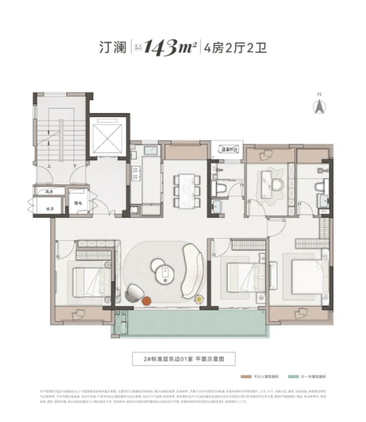 主力户型:仅设建面约 127㎡和143㎡两种四房两厅两卫户型,产品线高度统一,避免了刚改混杂。