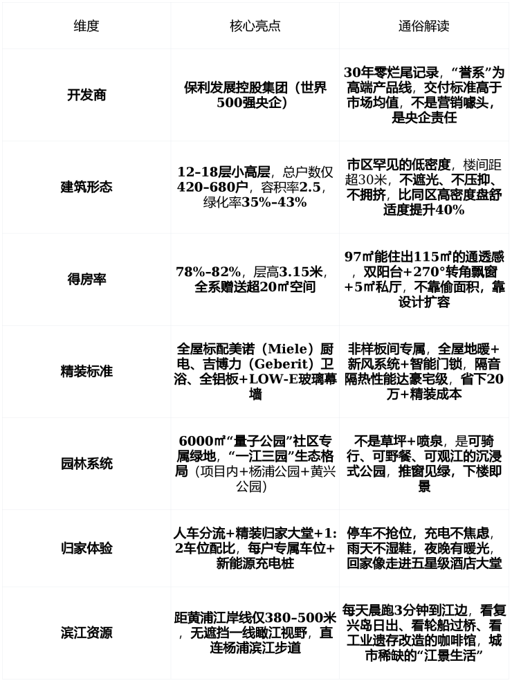 保利发展(央企)操盘、容积率仅2.5、绿化率35%–43%、直面黄浦江、百米即公园 ,是2026年上海 内环内唯一“低密滨江+央企精装+高得房率”三重稀缺的改善标杆