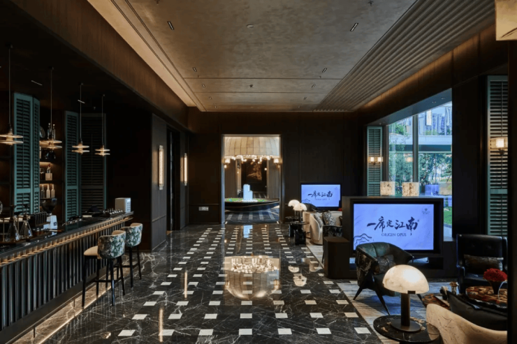 建筑风格:宋风现代美学,外立面采用宝格丽酒店同款进口维纳多奢石 + 超白玻幕墙