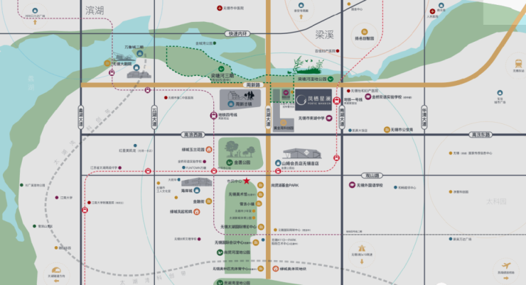 项目西侧规划小学与书香为邻,周边无锡市南湖中学、金桥双语实验学校、无锡外国语学校、江苏省太湖高级中学、无锡狄邦文理学校等名校环伺。