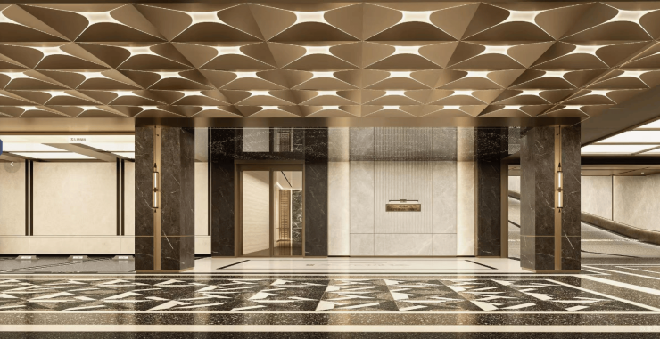 建筑外立面 银色铝板+玻璃幕墙+宋式官帽顶部设计,现代美学与东方隐逸融合,辨识度极高