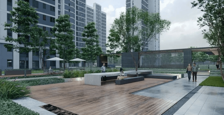 社区内设中央花园、泛会所架空层、沿河景观带等休闲节点