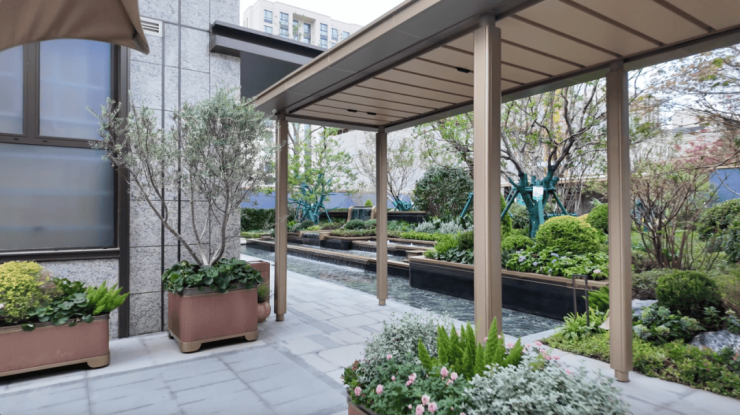 通过前厅步入社区内部,庭院景观也做到实景呈现,金隅以“海派繁花”为主题,设置了不同风格的休憩节点,种植了桂花树、老榆树、大乌桕等名贵树种。