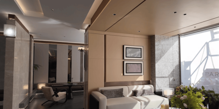 接着走进售楼处,这里也是未来社区出入的前厅,延续了别致的海派腔调。地面是融入玉兰花标志的海派拼花,采用昂贵的香格里拉黑石材,墙面则用上了稀缺的奥特曼米黄、莫奈花园奢石。