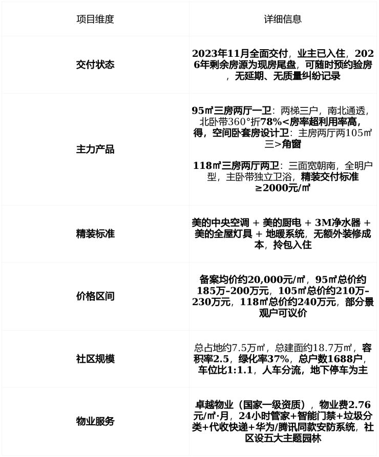 在售状态2023年11月首批交付,2026年为现房清盘阶段无期房风险实景可验、即买即住 ,主力产品为 95–118㎡精装高层三房备案均价约20,000元/㎡总价区间185万–240万元剩余尾盘有限,以景观优选户为主